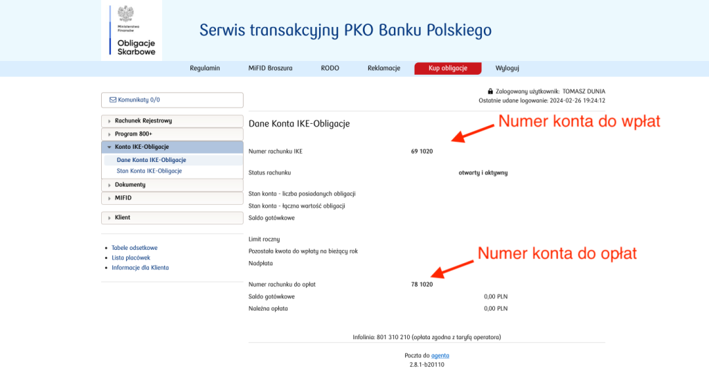 Przelewamy oszczędności na numer konta podpisany Numer rachunku IKE w zakładce Konto IKE-Obligacje -> Dane Konta IKE-Obligacje.