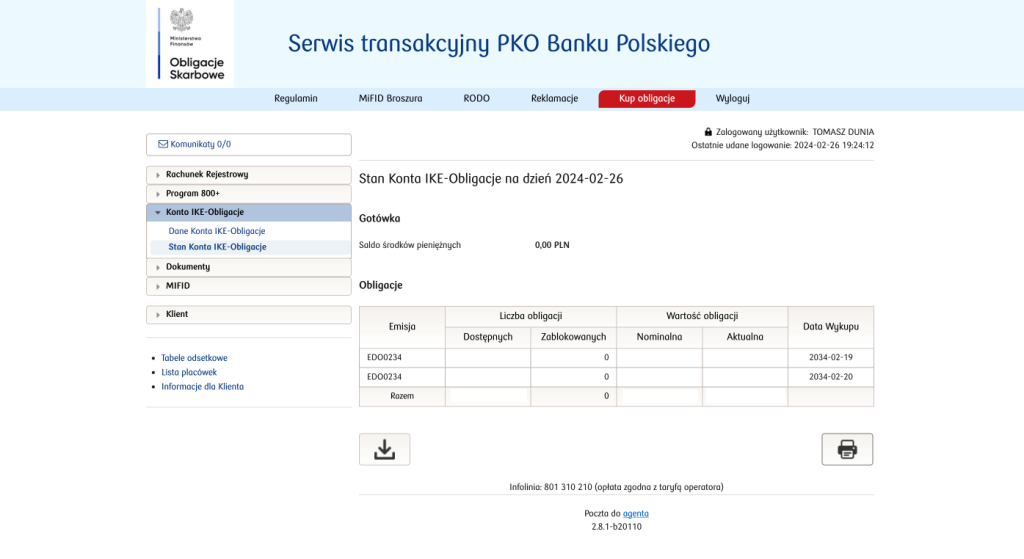 Po upływie jednego dnia roboczego od zaksięgowania wpłaty zostaną zakupione obligacje zgodnie z DNOS, co można zaobserwować w zakładce Konto IKE-Obligacje -> Stan Konta IKE-Obligacje.