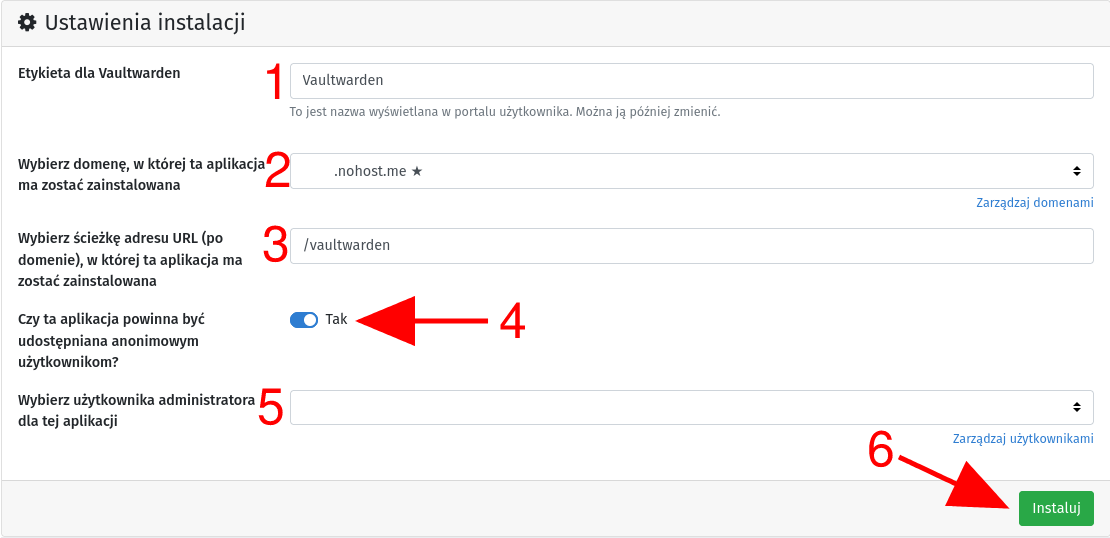 In the next text field [3], define the exact path under which Vaultwarden should be installed. By default, entering the value /vaultwarden will install it at example.domain.com/vaultwarden, where example.domain.com is the domain you selected above. If you have decided to use a dedicated domain only for Vaultwarden, you can enter / here, which will mean installation in the parent directory of the domain.