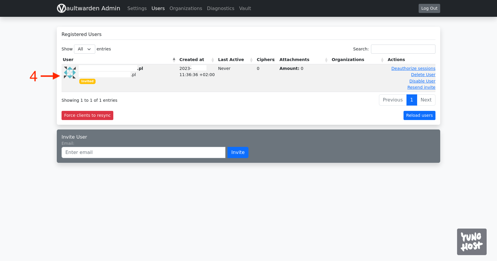 Na dole znajduje się sekcja Invite User. W polu tekstowym [2] podajemy swój adres e-mail i potwierdzamy przyciskiem Invite [3].