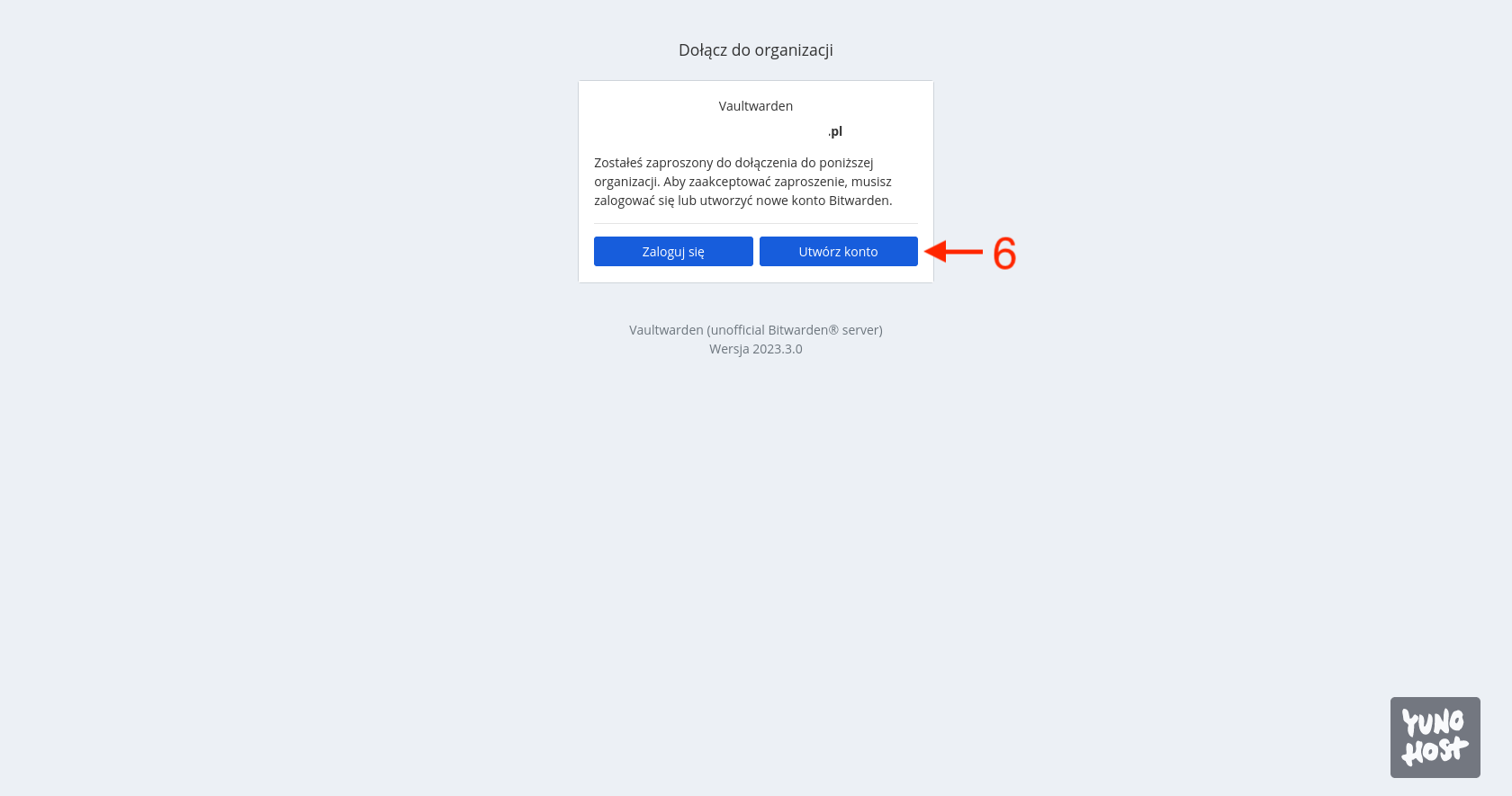 Zostaniemy przeniesieni z powrotem do przeglądarki, gdzie zobaczymy komunikat mówiący o tym, że zostaliśmy zaproszeni do organizacji i możemy z niego teraz skorzystać. Naciskamy przycisk Utwórz konto [6].