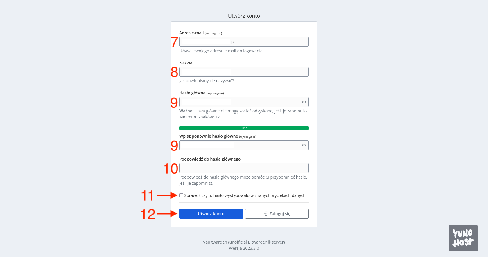 Zostaniemy przeniesieni do standardowego formularza rejestracji, w którym podajemy adres e-mail [7], nazwę użytkownika [8], hasło (dwa razy) [9] i opcjonalnie podpowiedź do hasła [10]. Na koniec możemy jeszcze zdecydować [11] czy chcemy, aby nasze hasło było wyszukane w znanych zbiorach haseł, które wyciekły. Ja jednak tego celu używam strony HaveIBeenPwned.com, więc zawsze odznaczam to pole. Wypełniony formularz potwierdzamy przyciskiem Utwórz konto [12].