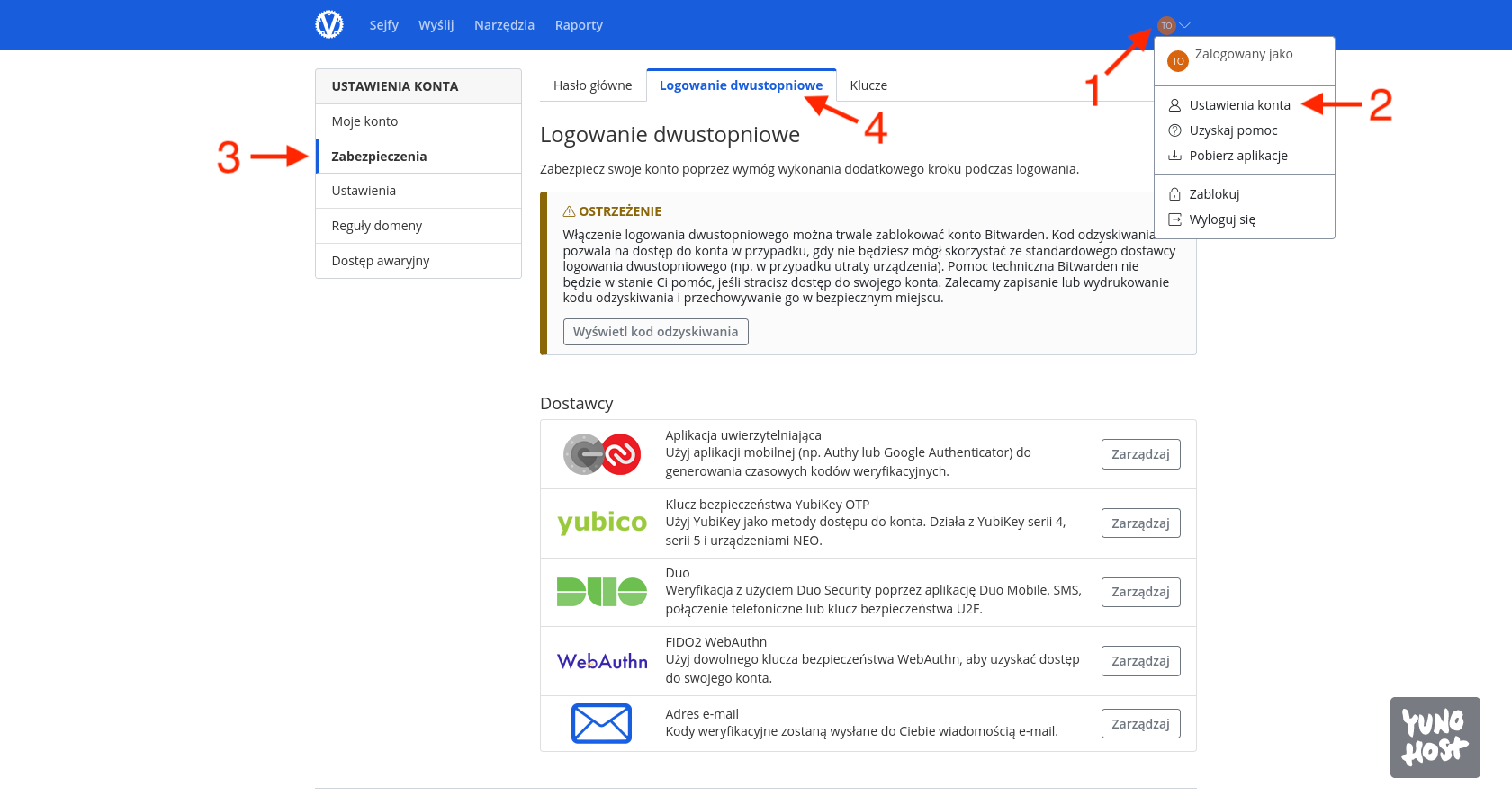 Pierwszym z nich jest włączenie dwuskładnikowego uwierzytelnienia podczas logowania, bo zabezpieczenie swoich haseł to podstawa. Realizuje się to poprzez rozwinięcie menu użytkownika znajdującego się w prawym górnym rogu [1], wejście w Ustawienia konta [2], następnie po lewej zakładka Zabezpieczenia [3] i Logowanie dwustopniowe [4]. W tym miejscu można skonfigurować takie zabezpieczenia jak TOTP (aplikacje z kodami czasowymi), klucze sprzętowe Yubico (YubiKey) czy w ostateczności (bo jest to najgorsza forma) kody przesyłane na skrzynkę mailową.