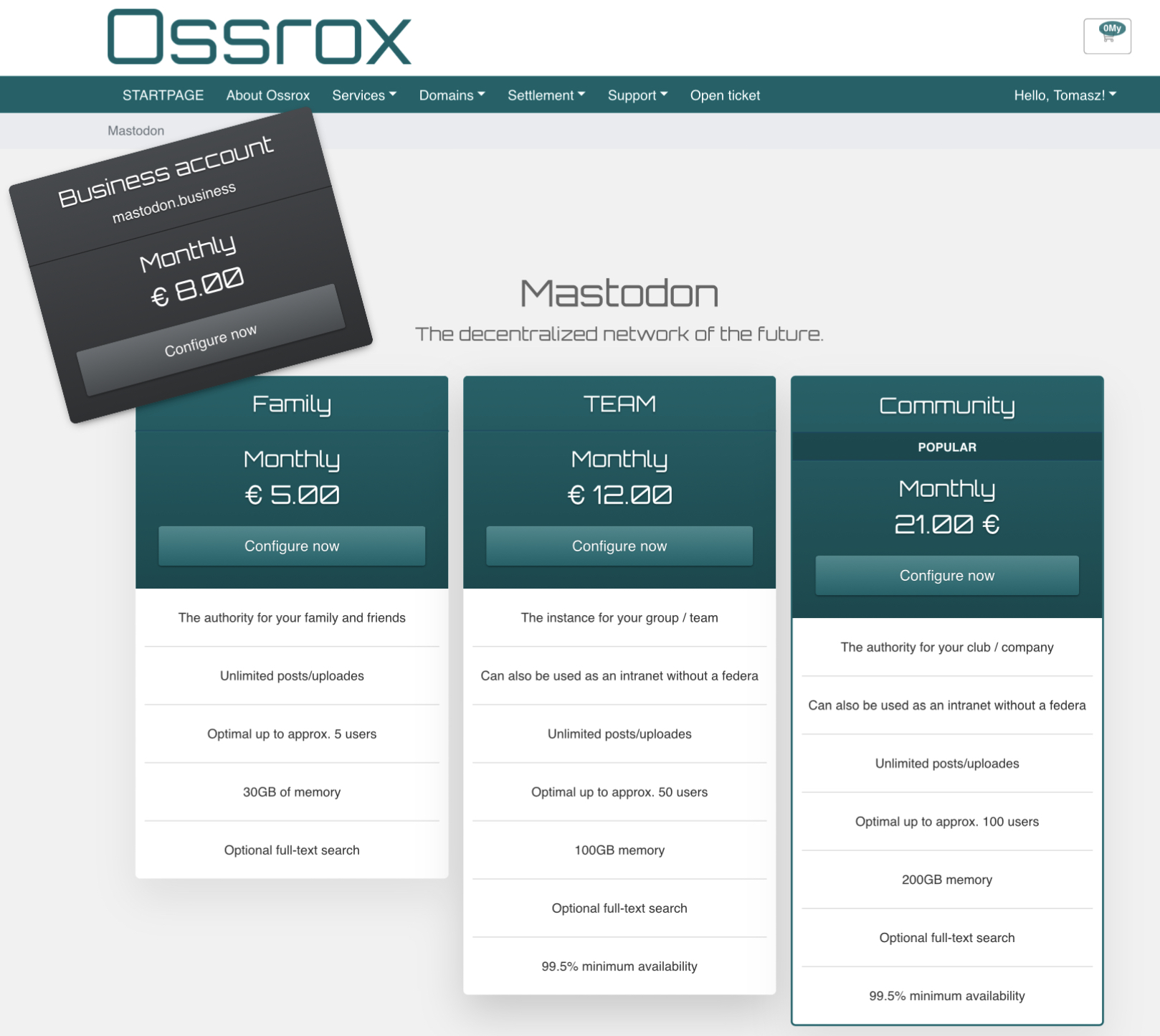 As a managed hosting for my instance, I chose ossrox.org, which, after a short market research, turned out to be a provider with the best price-to-quality ratio, or rather the offered parameters. Additionally, it seems to be a fairly small company run by two Germans, so I thought there was a chance that they would be more flexible than larger providers. In retrospect, I can already say that I was partly right, because there were a few things that could be configured in Ossrox that are not configurable, for example, in masto.host. I chose the lowest package Familie, which costs 5 euros per month. When choosing a managed hosting, the most important thing to pay attention to is the amount of disk space offered. In the Familie package at Ossrox, I have 30GB, which in my opinion is OK, but it would be great to have about 100GB or at least 50GB. Of course, all of this depends on how you use Mastodon, and specifically on how many people you follow and how much data those people generate (mainly referring to videos and photos, which take up the most space on the instance’s disk). Looking at my own example - I have about 300 followers who generate about 6GB of data with a 3-day data retention (more on this later). So, it can be assumed that one person generates about 6.6MB of data per day. Therefore, 30GB of memory should be enough for me, while maintaining these settings, for a scenario in which I follow 1500 people (5 times more than I need). If this is not enough, data retention can be reduced from 3 to 2 days, and then the maximum number of followers could theoretically reach 2250 accounts.