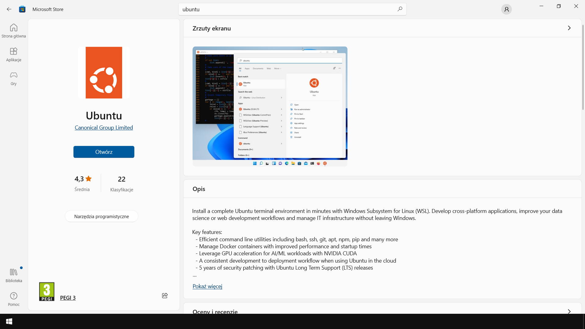 Po poprawnym zako艅czeniu instalacji konieczne jest ponowne uruchomienie komputera. Po wznowieniu pracy systemu wchodzimy do Microsoft Store, w pole tekstowe wyszukiwarki wpisujemy Ubuntu i przechodzimy do strony aplikacji, z kt贸rej poziomu mo偶emy zainstalowa膰 i uruchomi膰 艣rodowisko Ubuntu. Po zainstalowaniu jest ono tak偶e dost臋pne normalnie z poziomu menu Start lub je偶eli utworzyli艣my odpowiedni膮 ikon臋 na pulpicie. W Microsoft Store mamy tak偶e mo偶liwo艣膰 zainstalowania konkretnej wersji Ubuntu np. 22.04 LTS lub 20.04 LTS, daje to wyb贸r, w przypadku kiedy chcemy tak膮 konkretn膮 wersj臋, a nie inn膮.