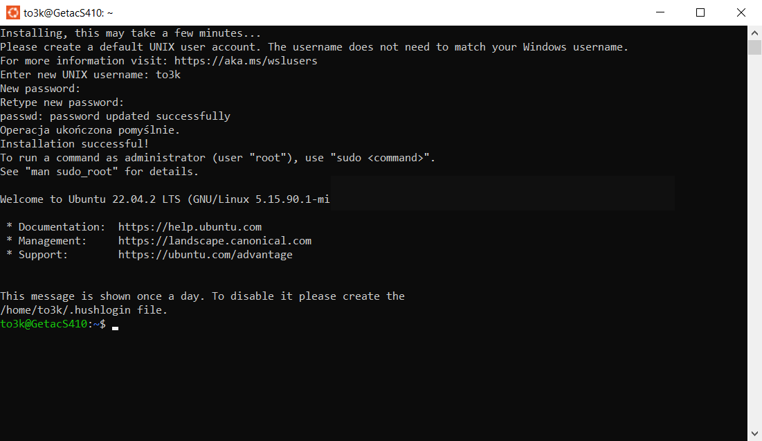 Po skorzystaniu z przycisku Otw贸rz, uruchomione zostanie okno terminala, w kt贸rym rozpocznie si臋 docelowa instalacja. W jej trakcie musimy paoda膰 nazw臋 u偶ytkownika oraz dwukrotnie has艂o. Po poprawnym zako艅czeniu ca艂ego procesu uzyskamy dost臋p do pow艂oki, kt贸ra niczym nie r贸偶ni si臋 od systemu Ubuntu postawionego np. na Raspberry Pi.