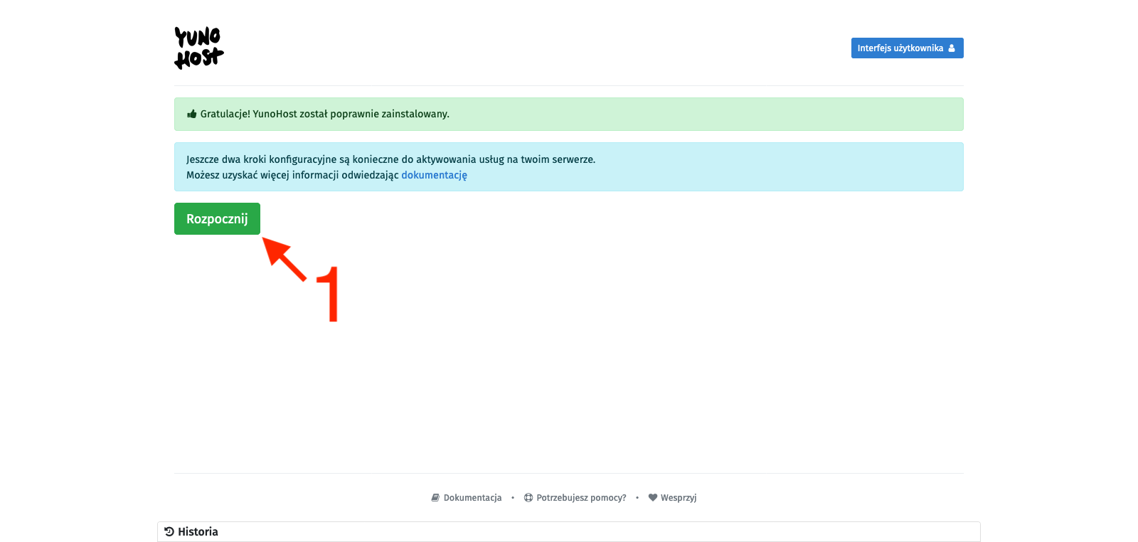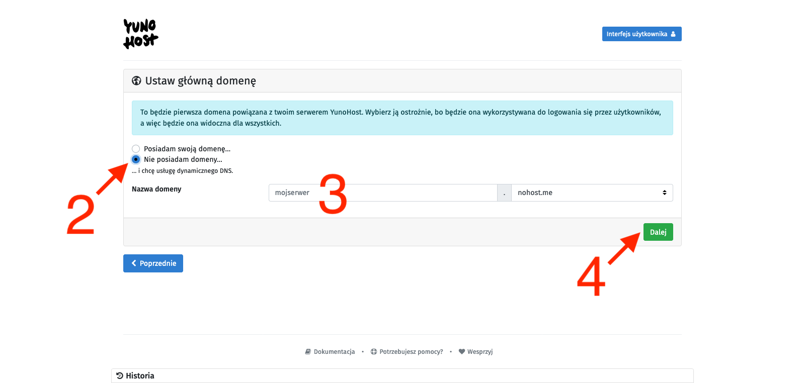 We will see the YunoHost welcome screen, which congratulates us on a successful installation and encourages us to further configure it. So we click the Start button [1]. In the main domain settings, we define the alias under which this administrative panel (and user panel) will be available, so we set up the alias that will allow us to avoid using the server’s IP address as a link to our YunoHost. There are two options: you can attach your external domain (or subdomain) here or use subdomains provided by YunoHost. They may end with: