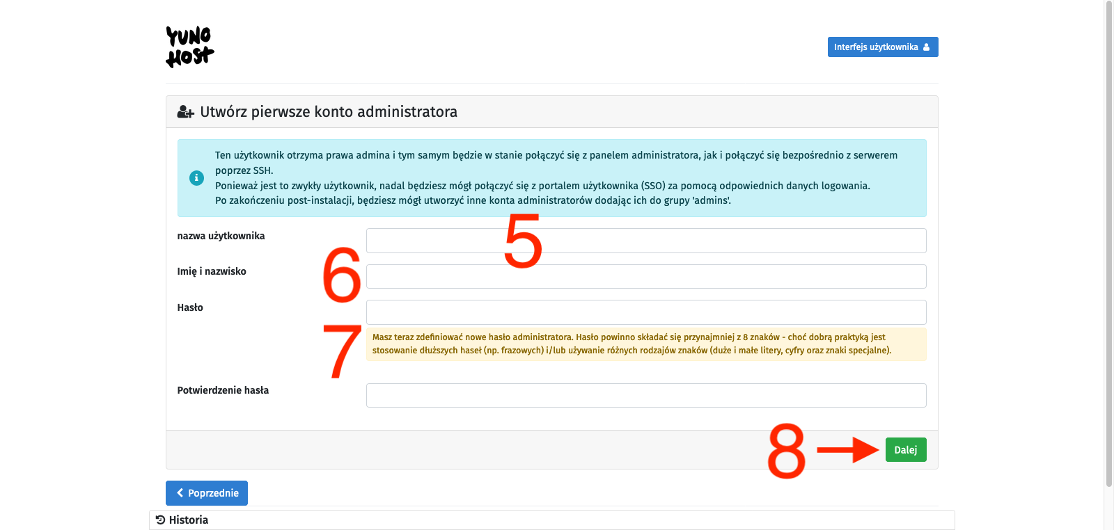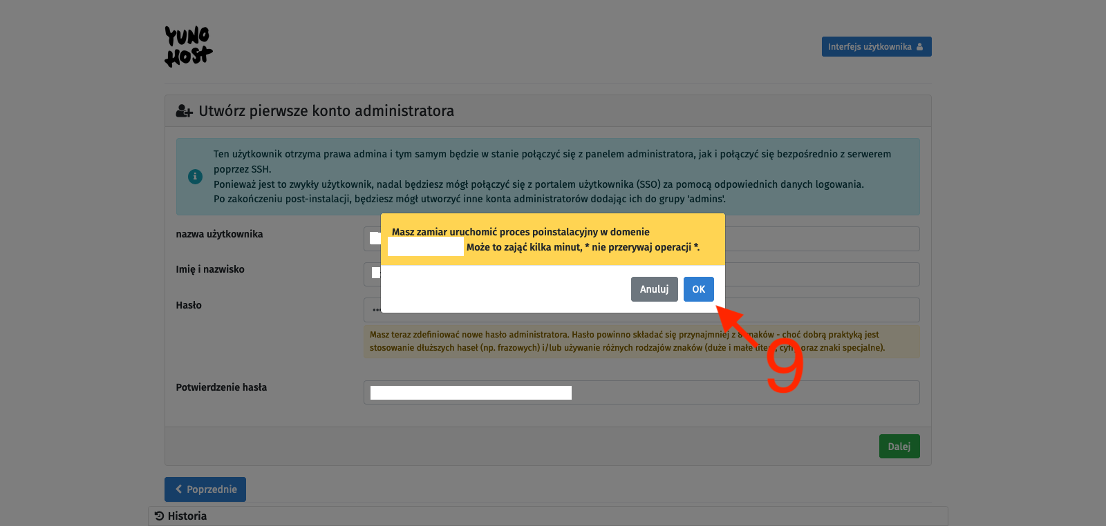 To avoid complications, we will use the second option, so we select the I don’t own a domain… option [2], type in the chosen character string in the Domain name text field [3], and confirm with the Next button [4]. On the next page, we create an administrator account. We fill in the fields: username [5], Full name [6], and enter the password twice [7]. We confirm with the Next button [8]. I probably don’t need to remind anyone here that the password should be strong enough as it is the only protection for our administrative panel against unauthorized access, and this whole infrastructure is available on the open Internet. Finally, we will be asked to confirm with the OK button [9]. After all this, we just have to wait for the process to finish, and we will be taken to the main control panel.