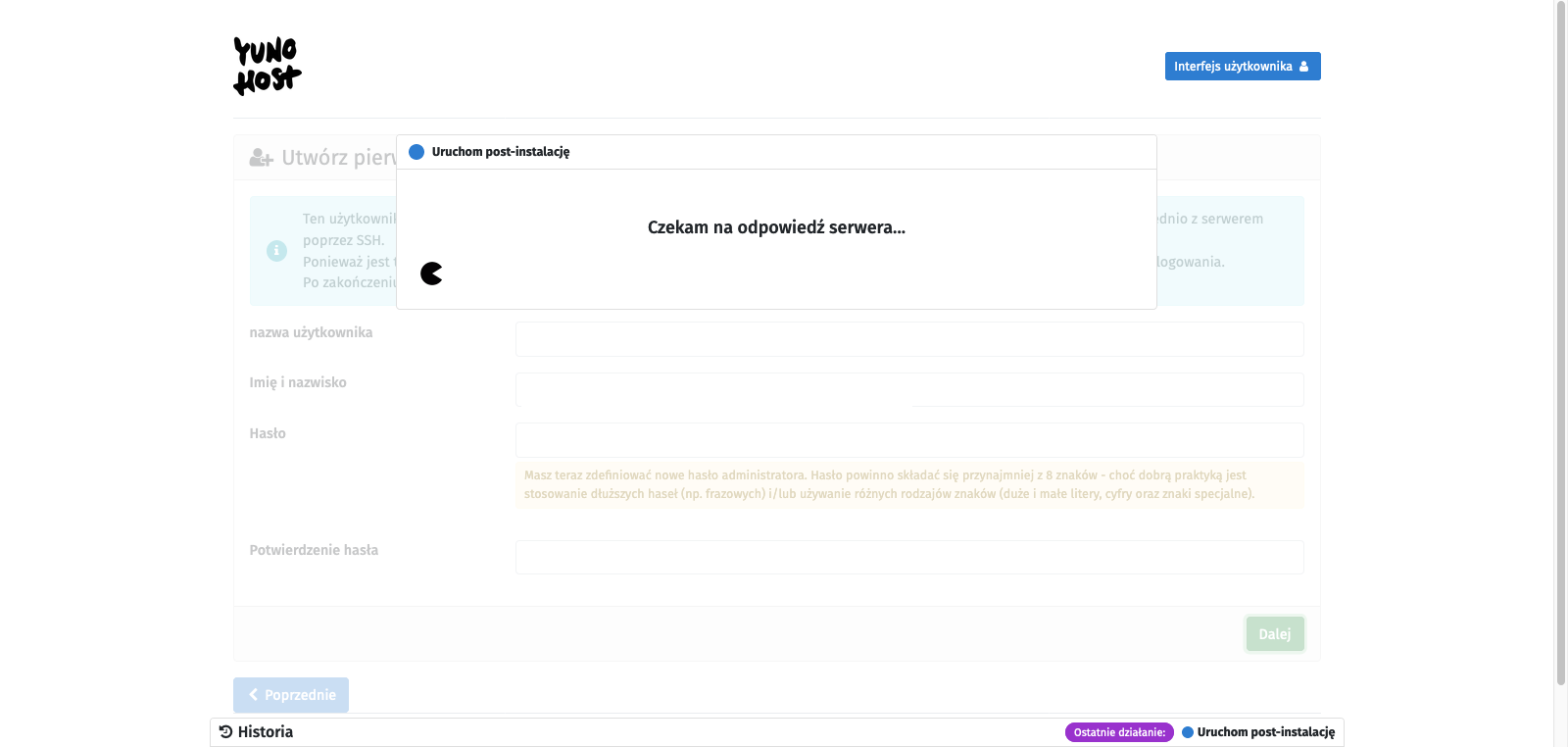 It is important that from now on, you should connect to the server using the credentials provided during the administrator account creation. Therefore, do not log in as the user debian but as the newly created user and use the new password instead of the SSH key. After the first login, it is good to return to logging in using SSH keys. I described how to do it here. It is also important to disable password authentication through the YunoHost web interface by going to (Main control panel) -> Tools -> YunoHost settings -> SSH section -> Password authentication -> change it to No, not by editing the sshd_config file as described in this post. Of course, both methods will work the same, but by editing the file from the terminal, YunoHost will later report it as an error that it has detected its modification, which can cause configuration conflicts.