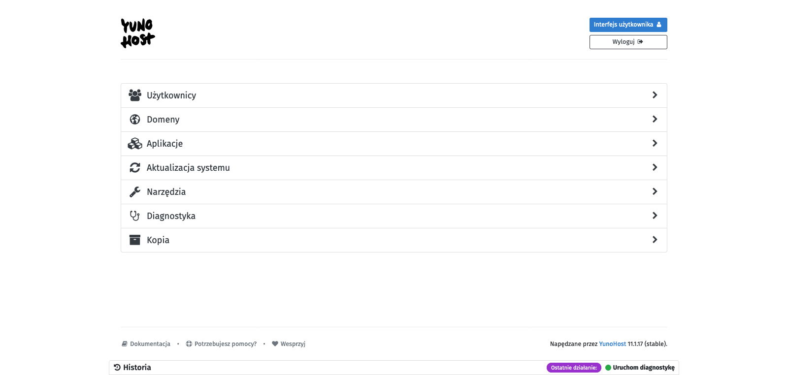 After entering the main control panel of YunoHost, I recommend that you first go to System update. The system will be immediately scanned for packages that can be updated. After scanning is completed, confirm by clicking the green Update all packages button at the bottom. After starting the first services, it will also be possible to update them from this menu. After seeing two messages - All system packages are up to date! and All programs are up to date! - return to the main panel.